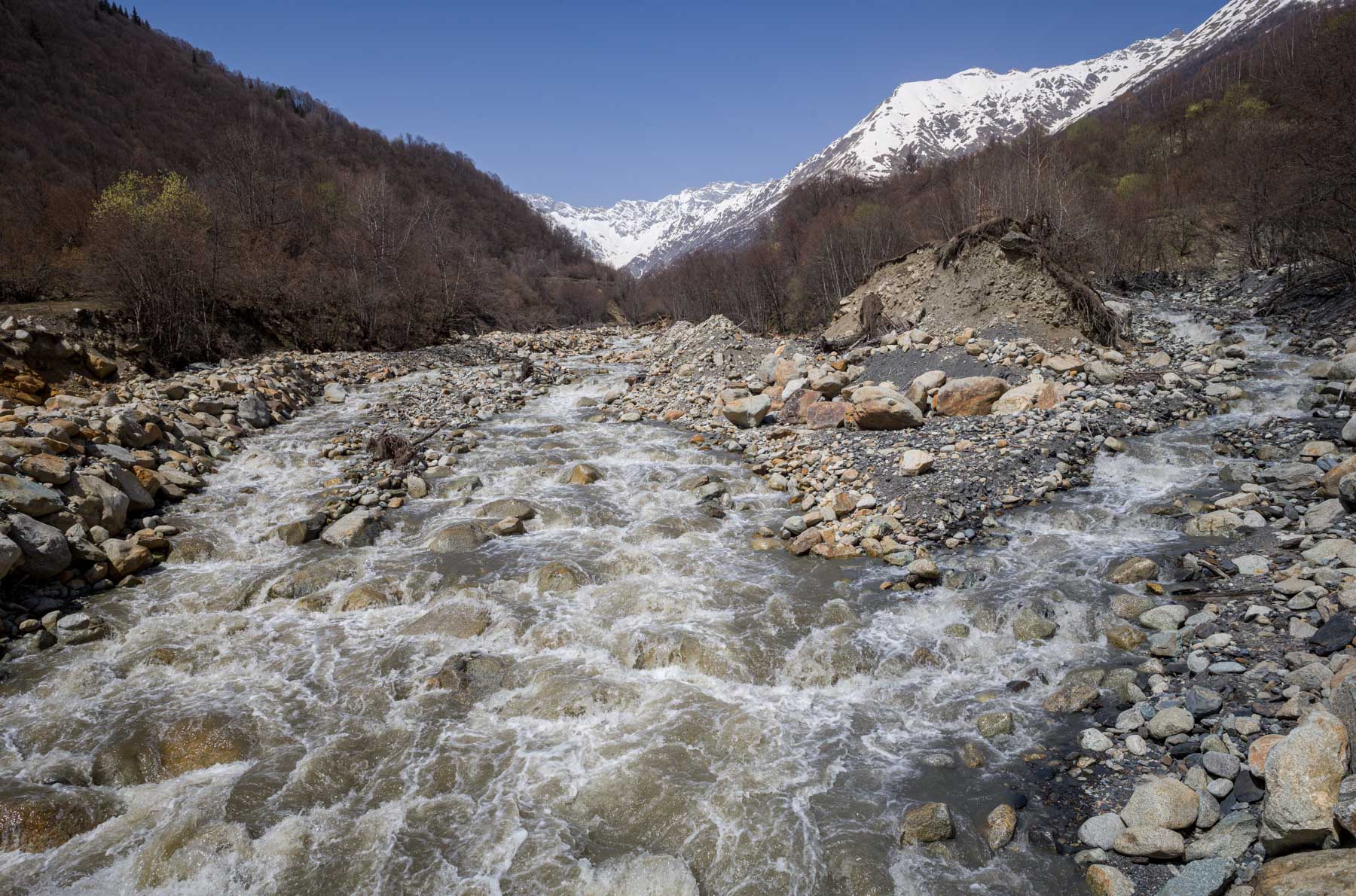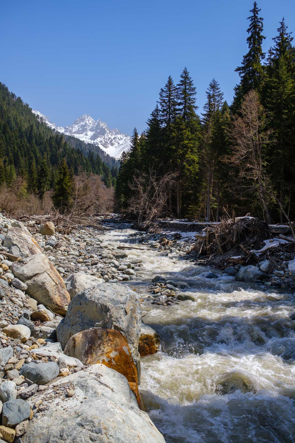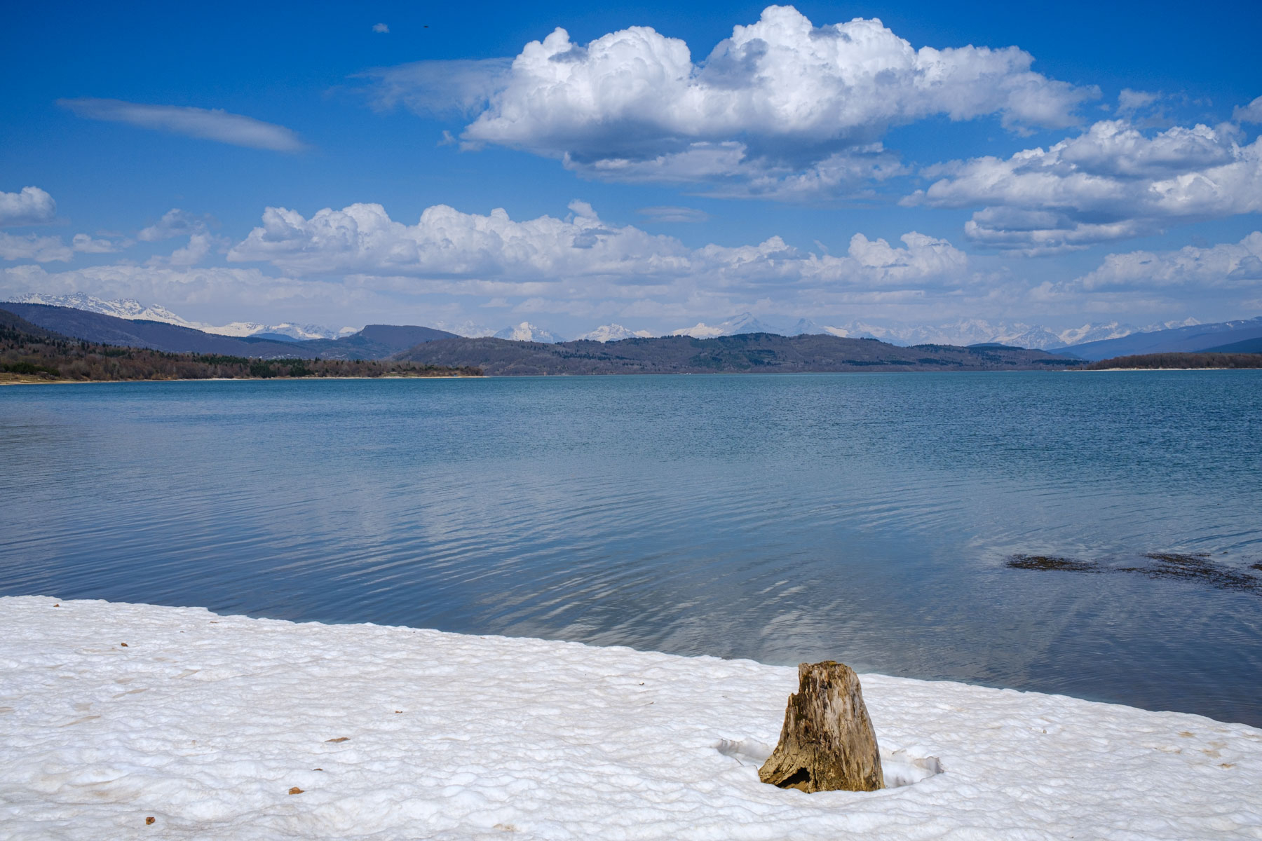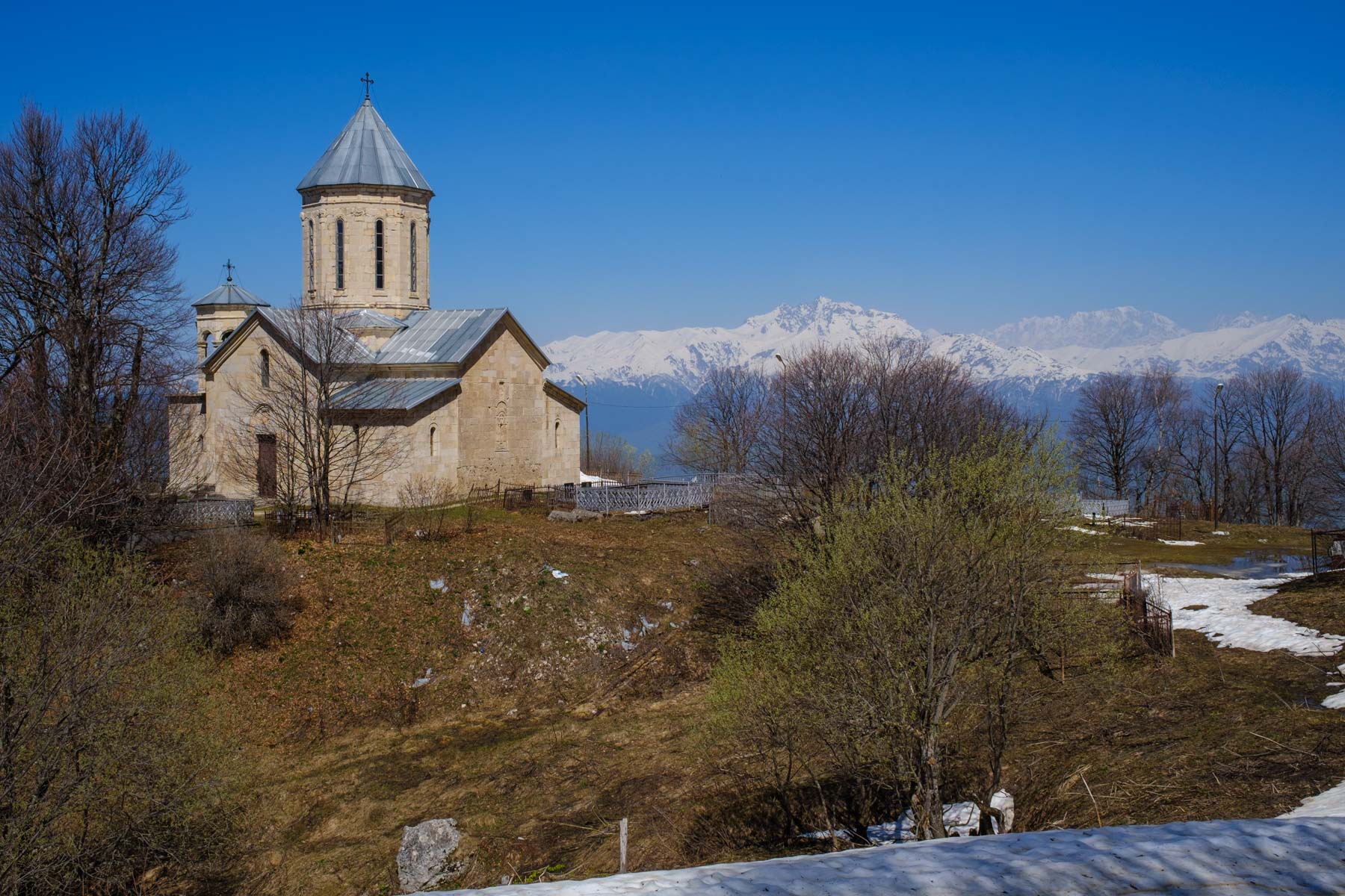 Wir fahren vorbei an Tkibuli (nur ein kurzer Stopp zur Besichtigung still gelegter Eisenbahnstrecken) und dann hinauf zum Shaori Stausee. Auch hier liegt noch recht viel Schnee, aber wir haben einen tollen Blick auf den großen Kaukasus. Wir passieren das Tor nach Radscha und werden im Vorbeifahren dann auch gleich mal gesegnet. Es war richtig nass, aber die Kamera kann das ja zum Glück ab.