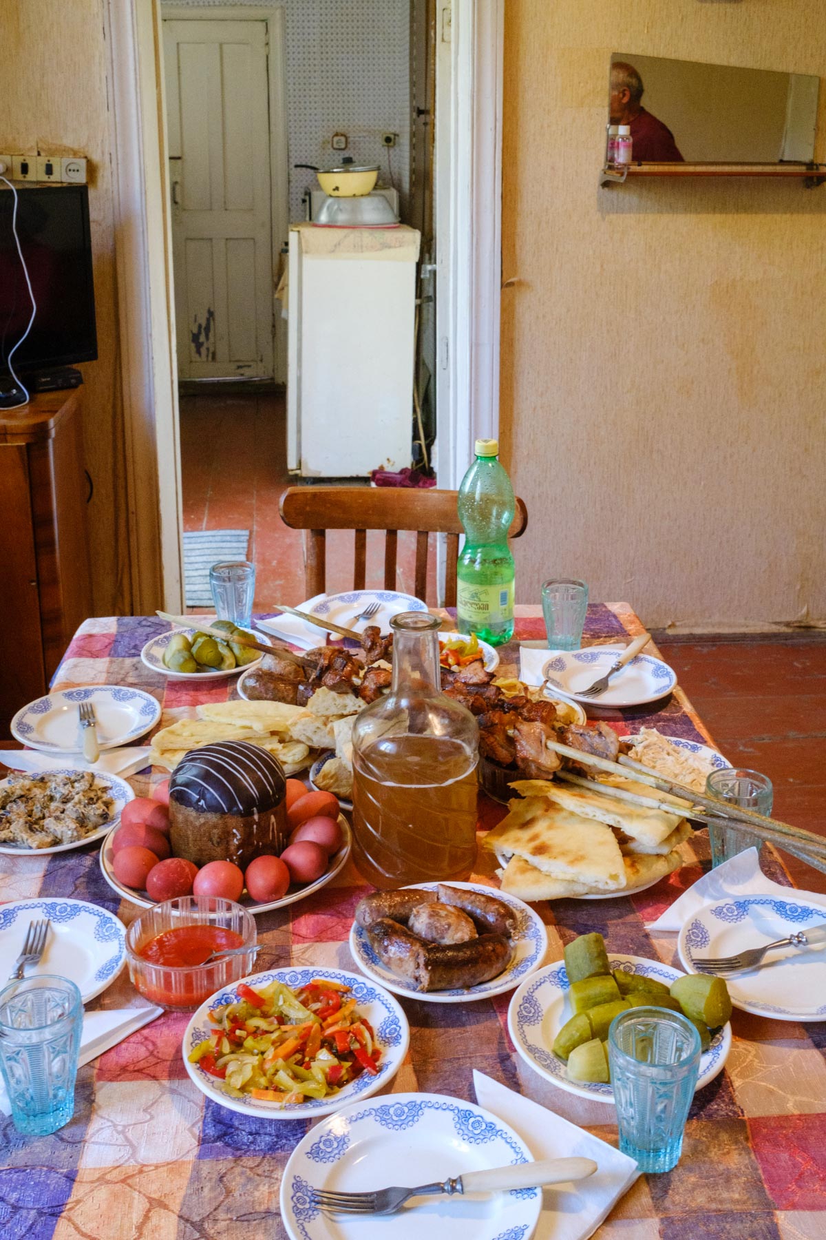 Nach dem Besuch auf dem Friedhof geht es dann nach Hause, um dort dann – na klar – gemeinsam zu Essen. Das heißt man isst in Georgien eigentlich immer. Und hier gab es neben Gemüse, Katschapuri (Brot mit eingebackenem Käse) natürlich auch Schaschlik und – wie sollte es anders sein – auch Wein.