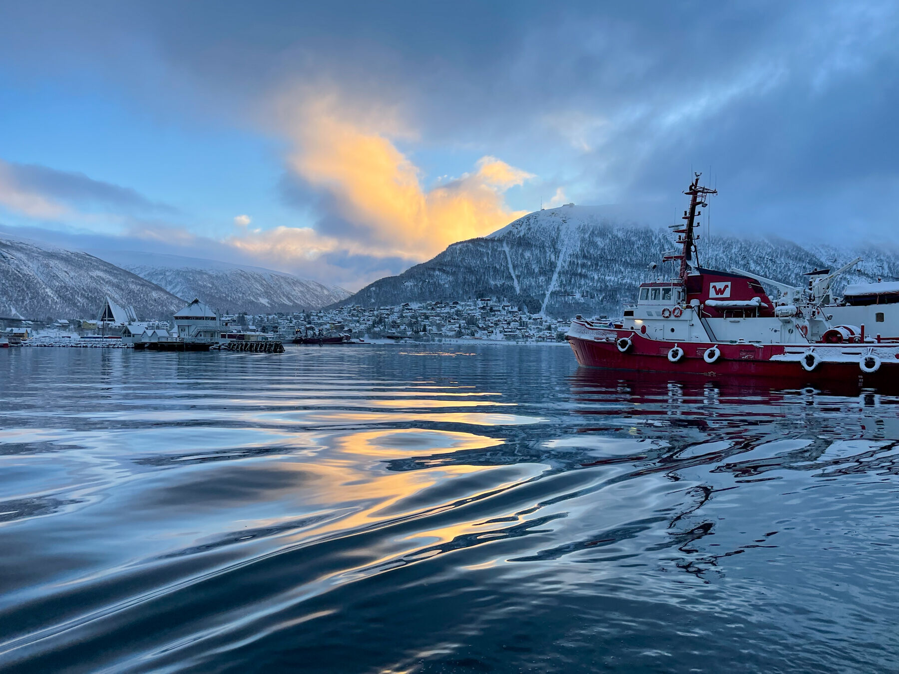 Der erste Morgen in Tromsø begrüßte uns mit grauem Himmel, aber um diese Jahreszeit reicht die Sonne ohnehin noch nicht bis in die Stadt. Wir gingen hinunter zum Hafen und konnten sehen wie das Licht langsam die Berge erhellte, aber bis auf die Beleuchtung einer Hausfassade die Stadt nicht erreichen sollte. Bei einem Sonnenhöchststand von 5° über dem Horizont und Bergen im Süden keine Wunder.